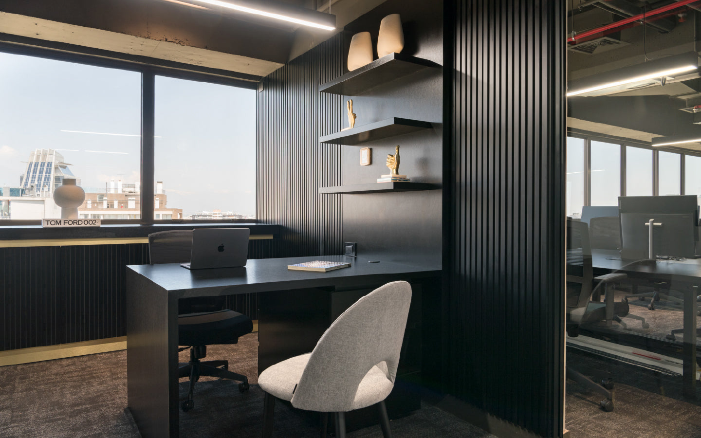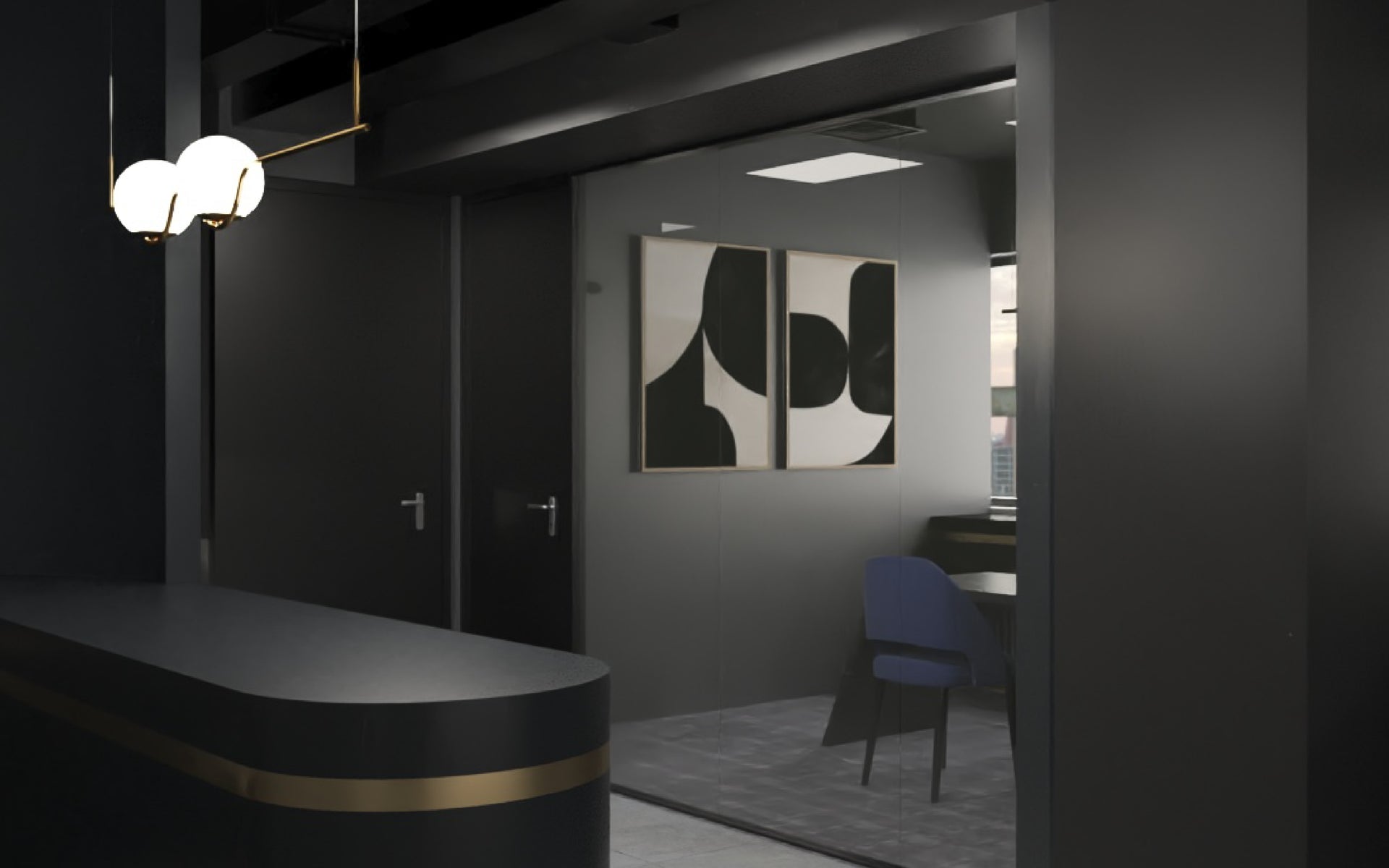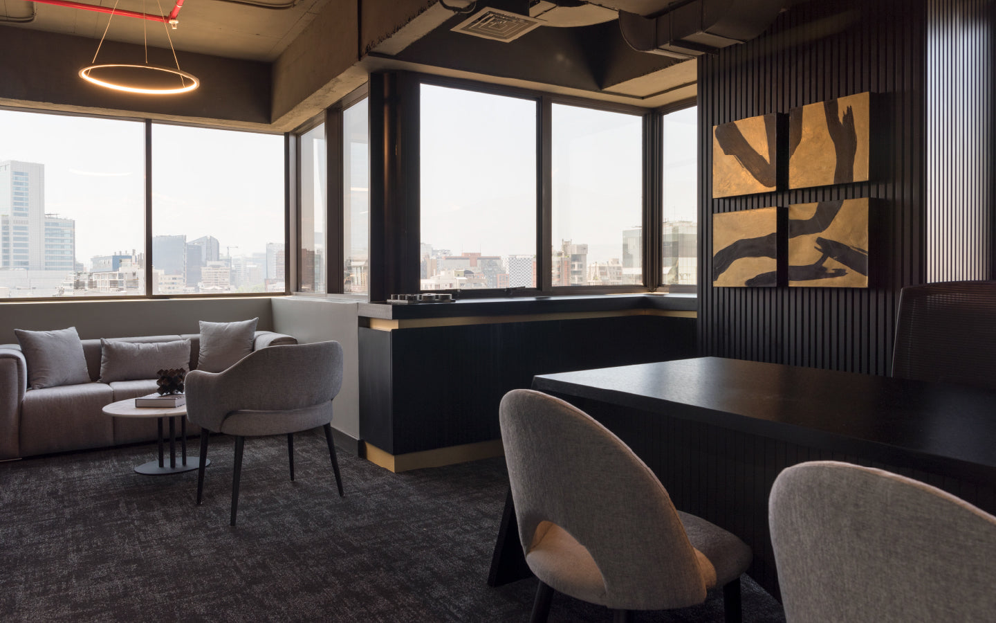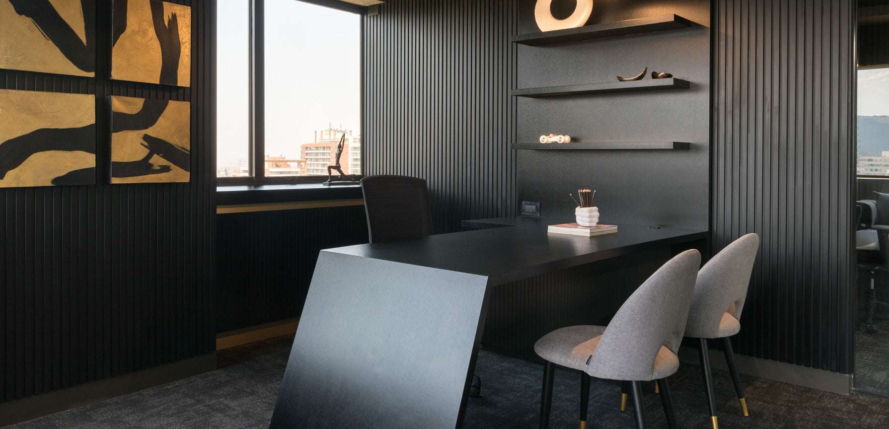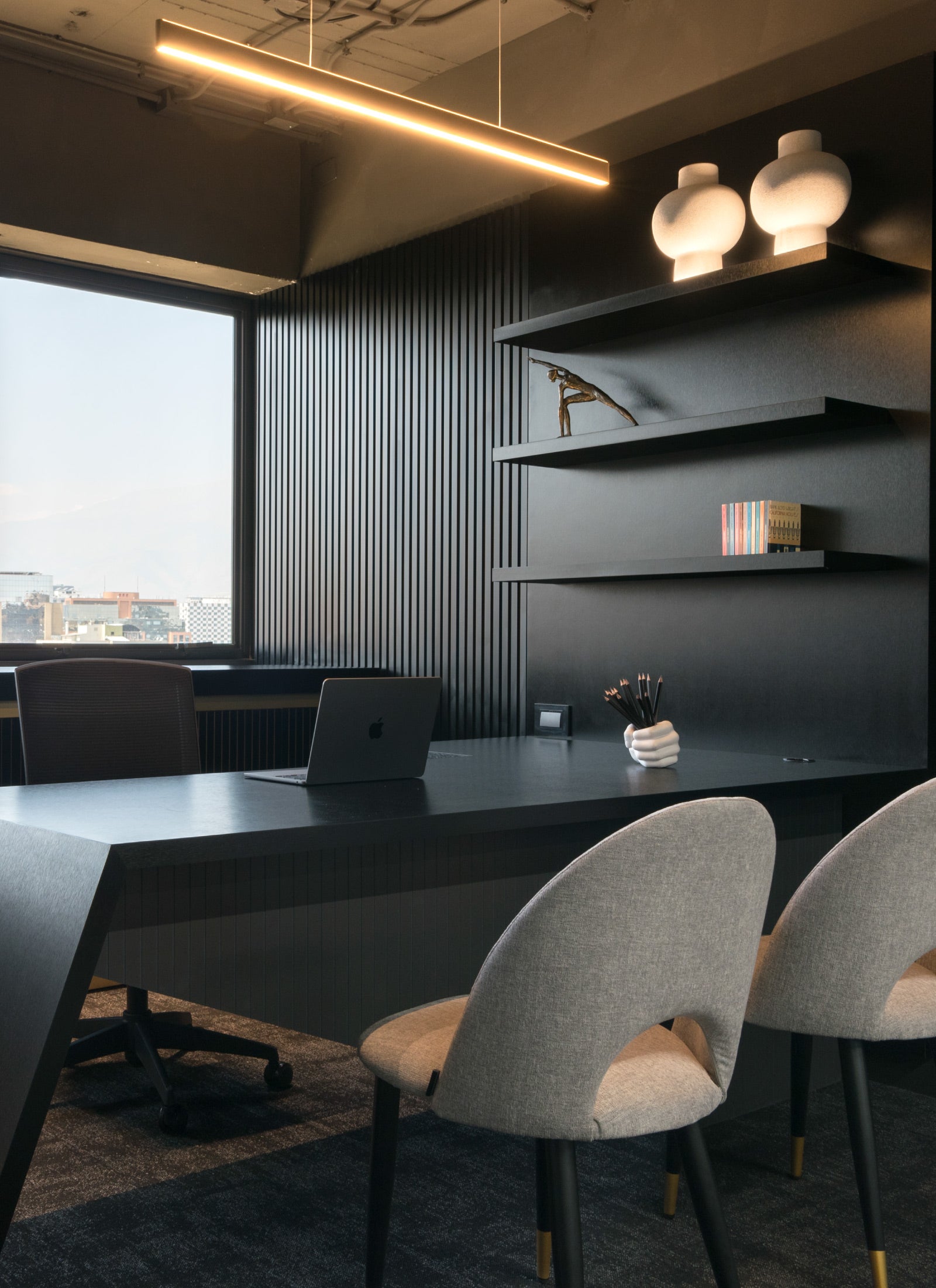 En este proyecto para un buffet de abogados que trabaja dentro de una compañía de software, se aprovechó una planta libre para generar distintos ambientes según las necesidades. La zona de gerencia se compuso de cuatro oficinas diseñadas con un estilo elegante, una paleta de colores oscuros y sutiles toques dorados que aportan sofisticación. En el área común se mantuvo la misma línea cromática, integrando una cocina central como punto de encuentro, pensada para que todos los colaboradores puedan reunirse, trabajar de forma colaborativa y disfrutar de un espacio compartido.