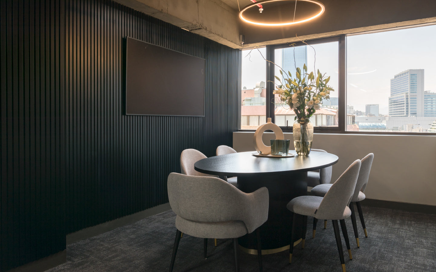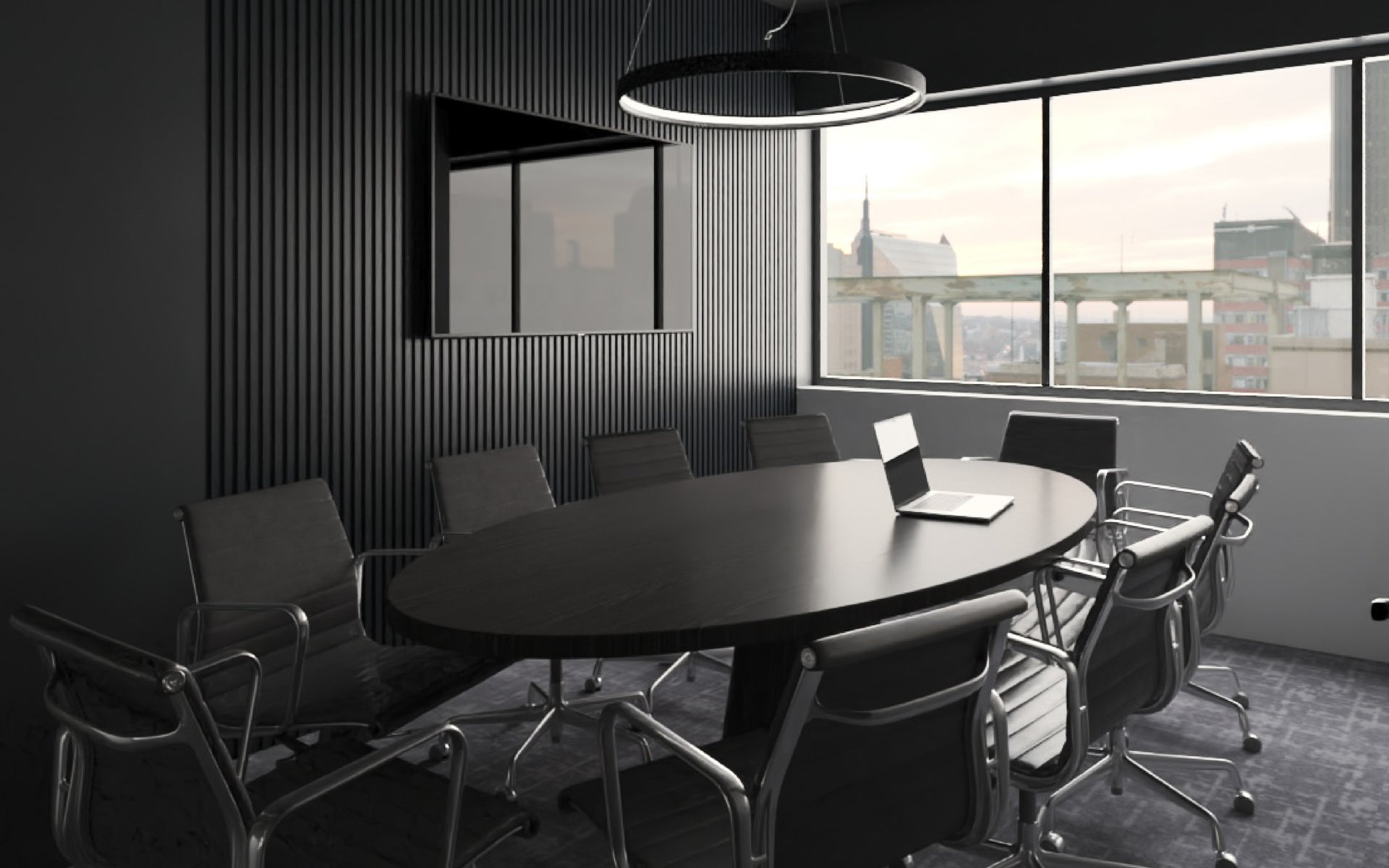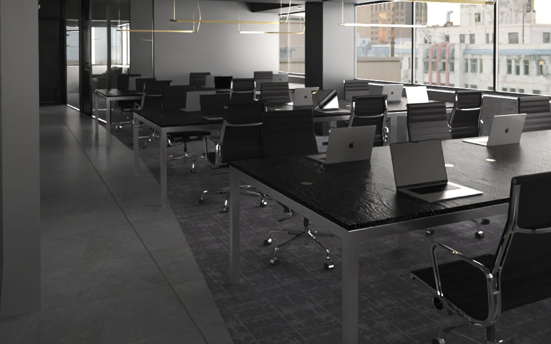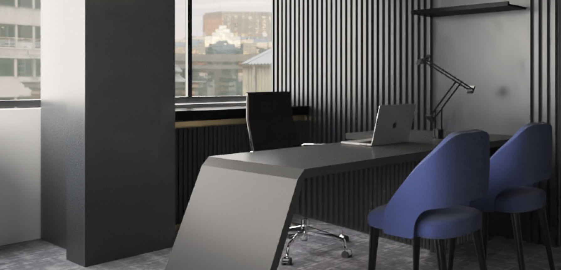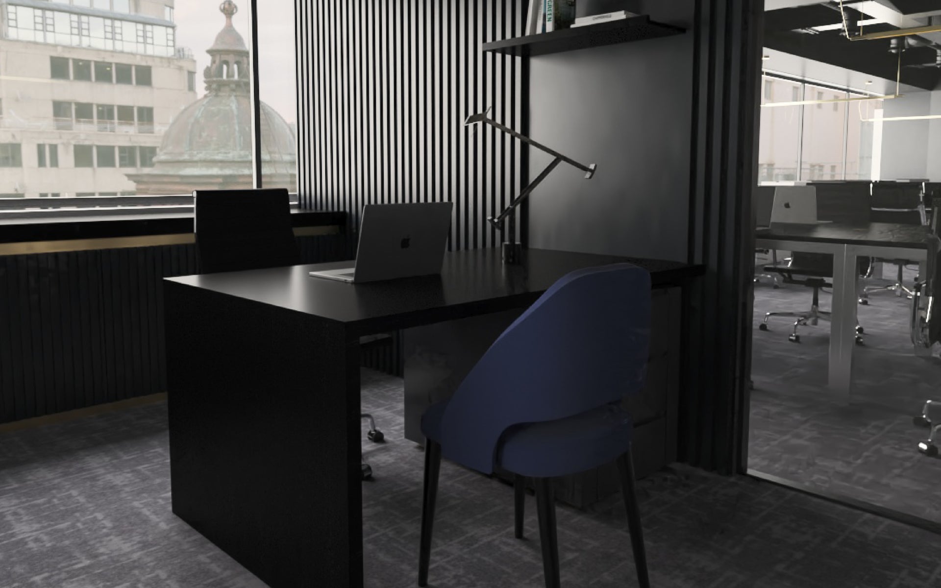 En este proyecto para un buffet de abogados que trabaja dentro de una compañía de software, se aprovechó una planta libre para generar distintos ambientes según las necesidades. La zona de gerencia se compuso de cuatro oficinas diseñadas con un estilo elegante, una paleta de colores oscuros y sutiles toques dorados que aportan sofisticación. En el área común se mantuvo la misma línea cromática, integrando una cocina central como punto de encuentro, pensada para que todos los colaboradores puedan reunirse, trabajar de forma colaborativa y disfrutar de un espacio compartido.
