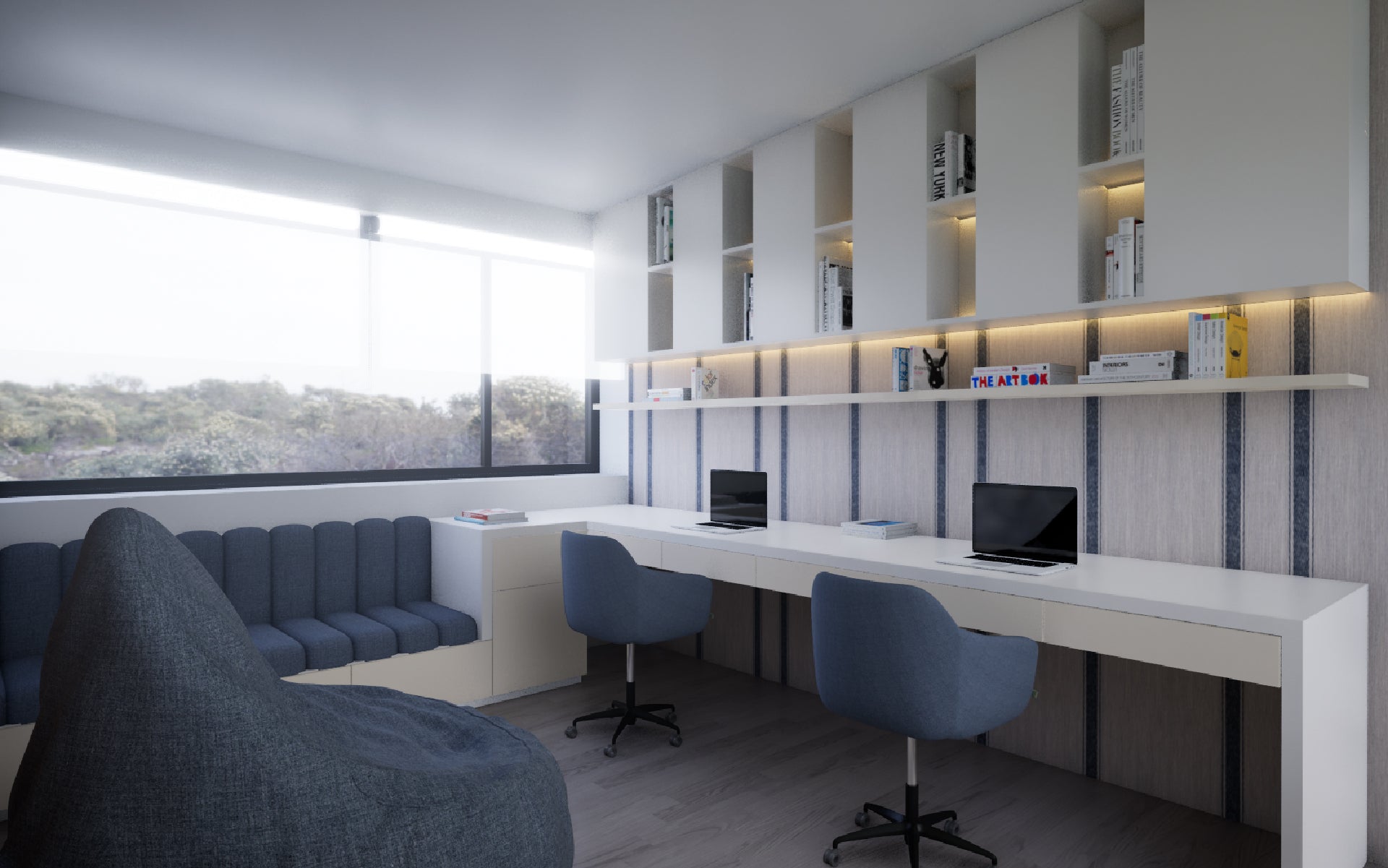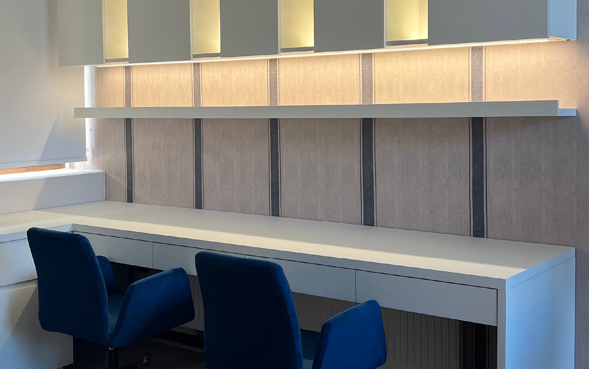 Proyecto en Chicureo: tonos neutros en la planta baja y azules en la zona infantil, logrando un espacio moderno, acogedor y estético.