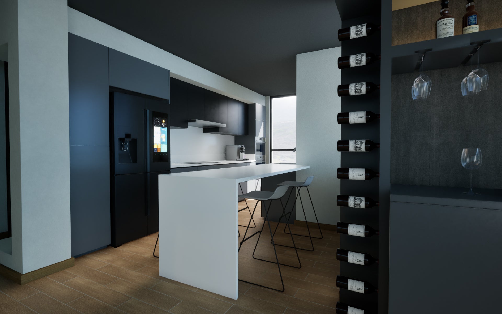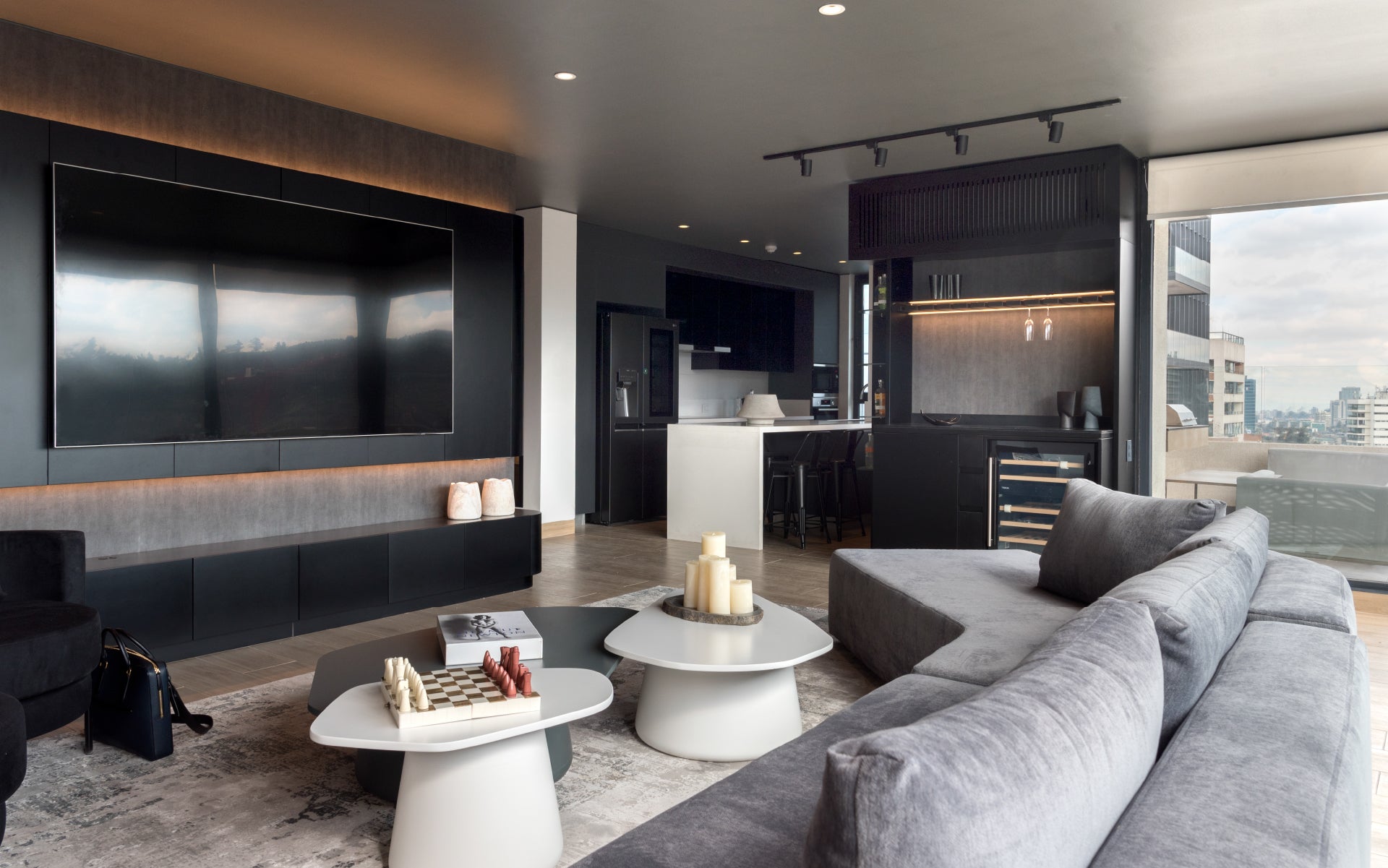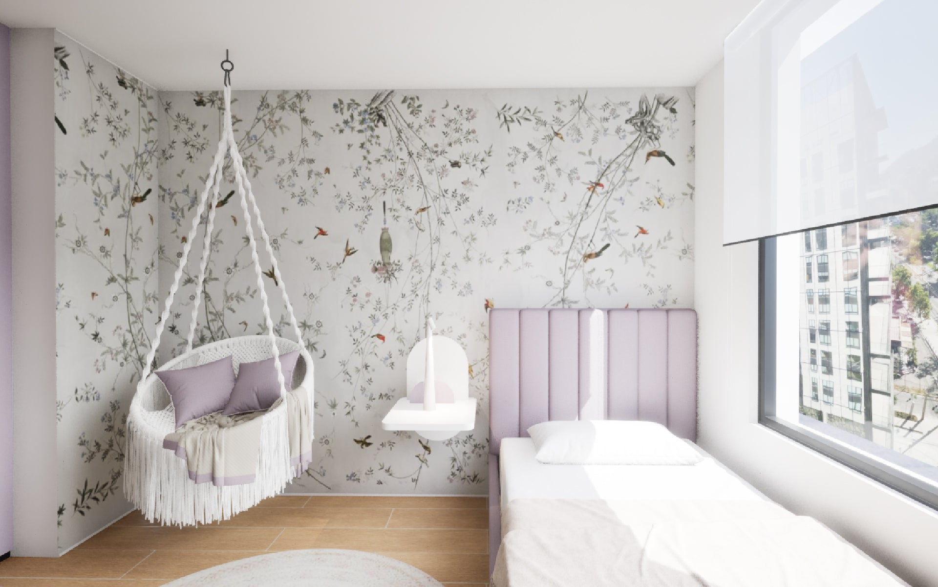 En este proyecto, los espacios combinados reflejan el gusto del padre, amante de los colores oscuros y el diseño atrevido, logrando un ambiente moderno, minimalista y armonioso para toda la familia. Por su parte, la habitación de su hija tiene un diseño mucho más femenino, con colores de niña como rosados y morados, manteniendo un estilo moderno y divertido que se adapta a sus preferencias.