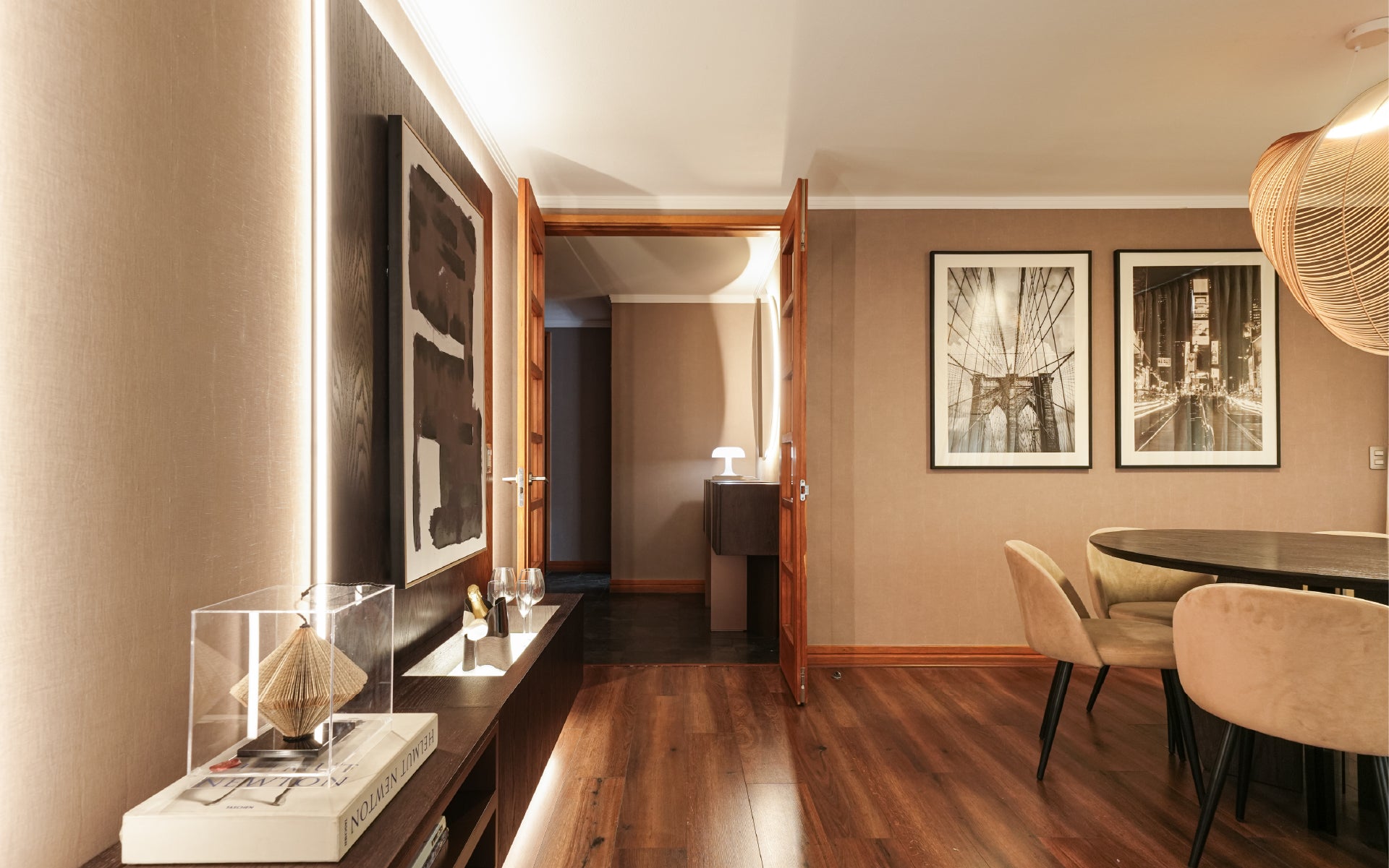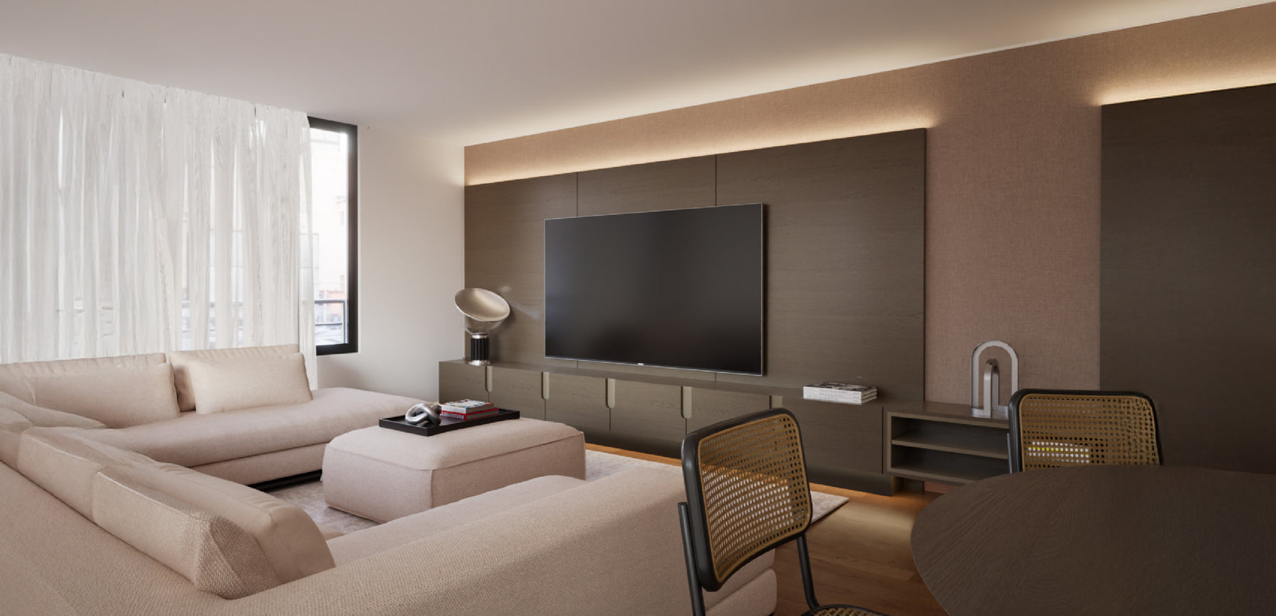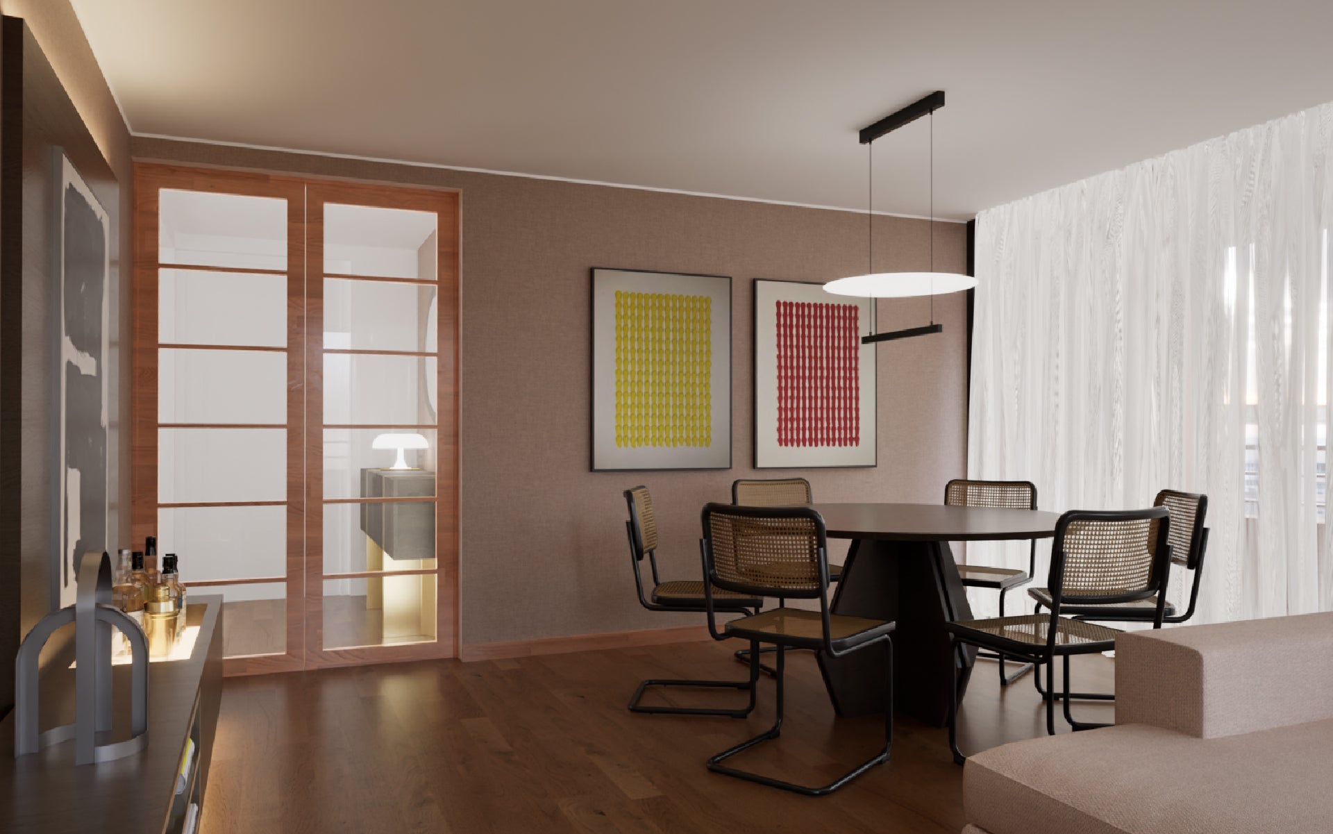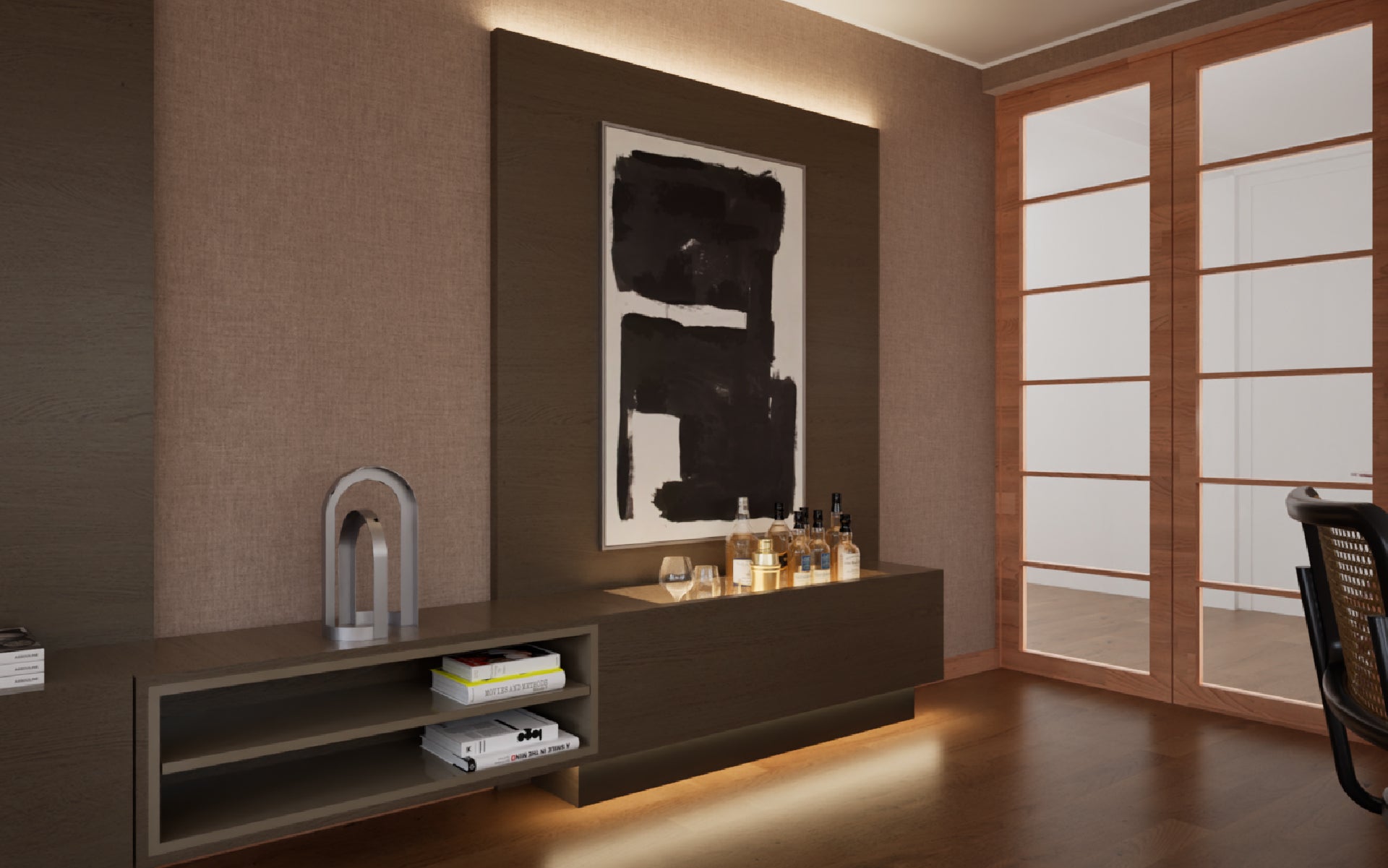 Este proyecto combina maderas oscuras, tonos neutros y una cuidada selección de texturas para crear un ambiente moderno, cálido y atemporal. La iluminación realza cada material y aporta profundidad, logrando un espacio elegante, coherente y perfectamente equilibrado.