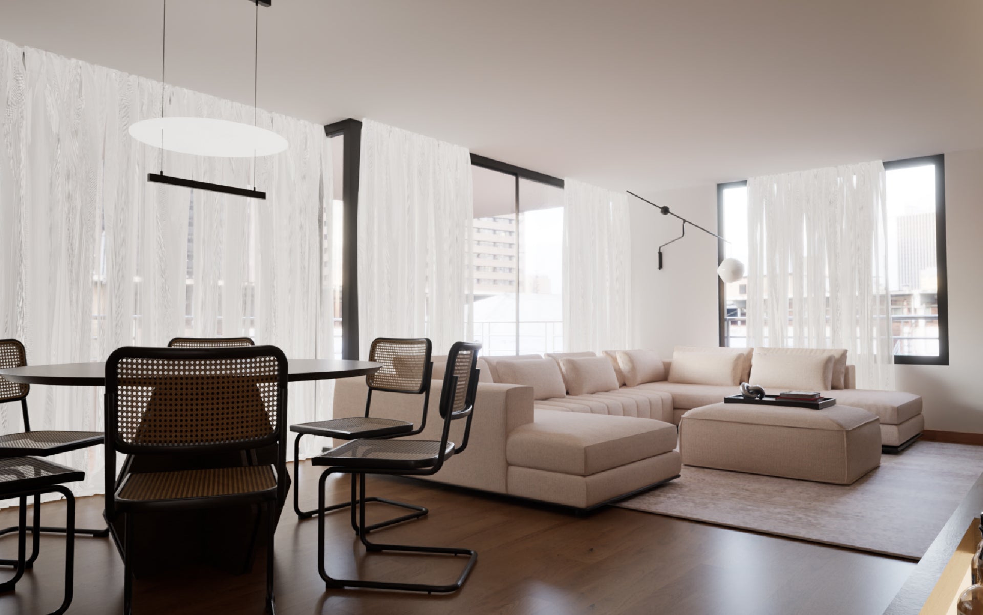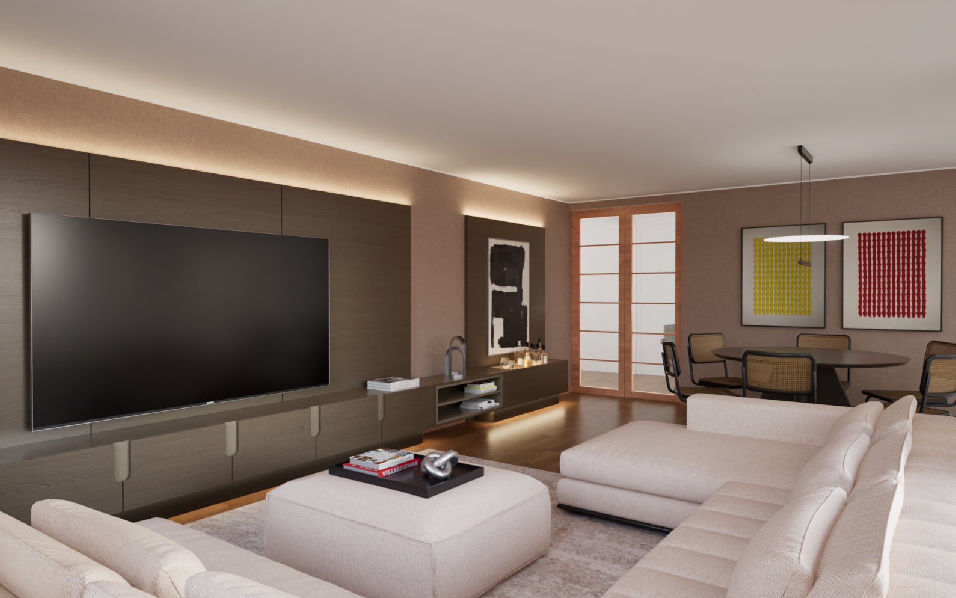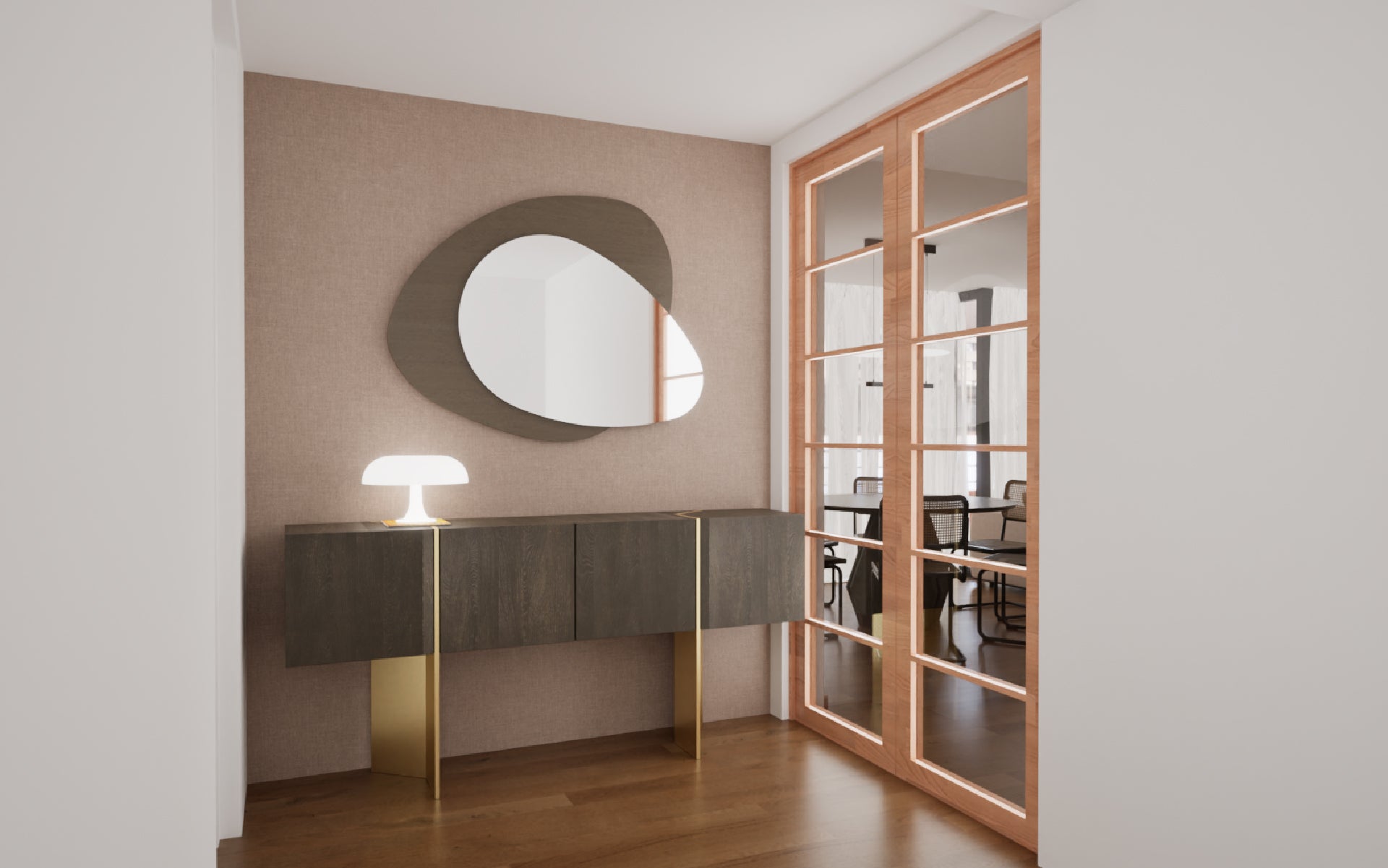 Este proyecto combina maderas oscuras, tonos neutros y una cuidada selección de texturas para crear un ambiente moderno, cálido y atemporal. La iluminación realza cada material y aporta profundidad, logrando un espacio elegante, coherente y perfectamente equilibrado.