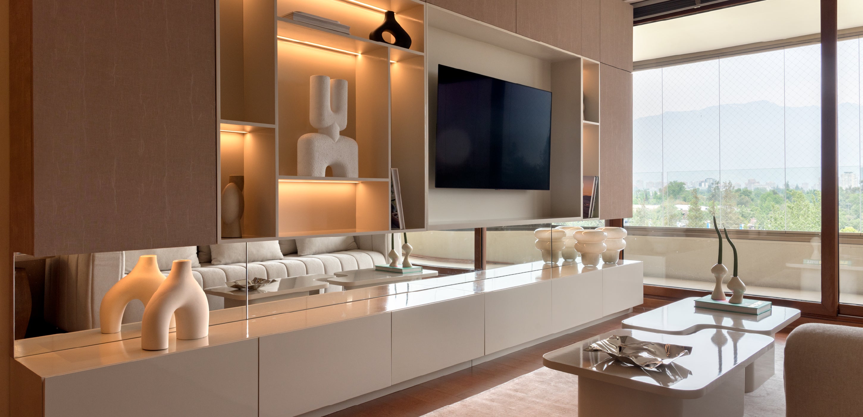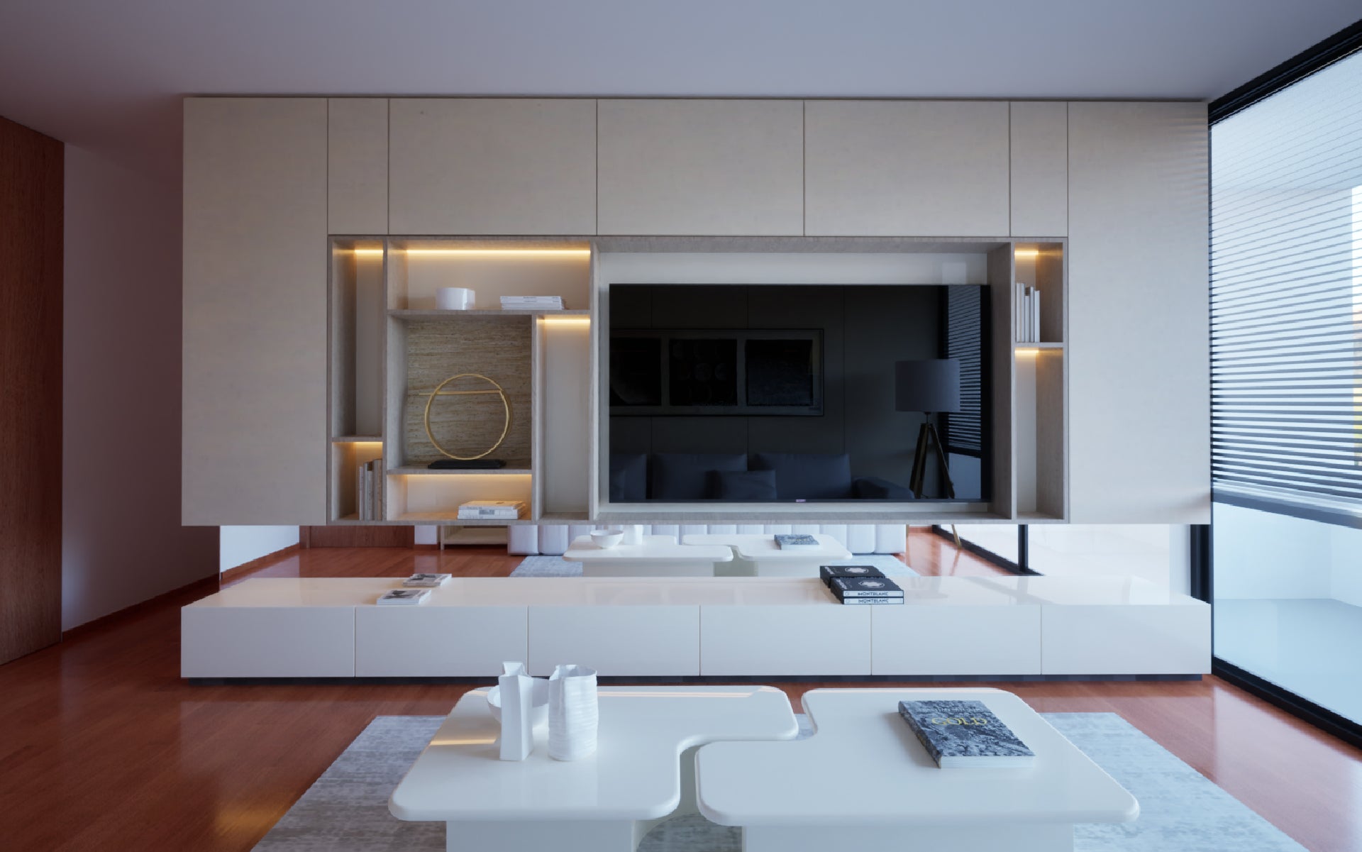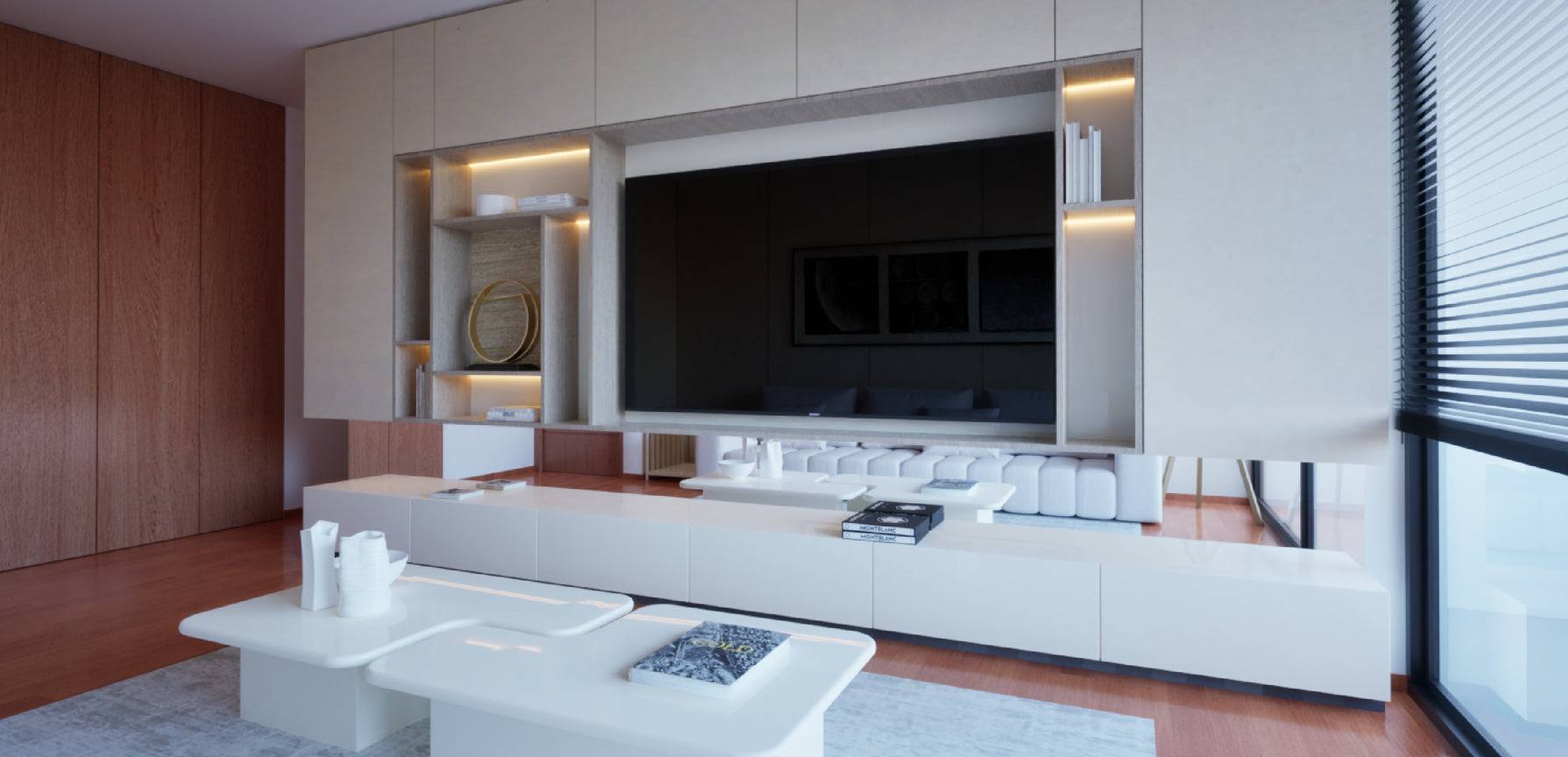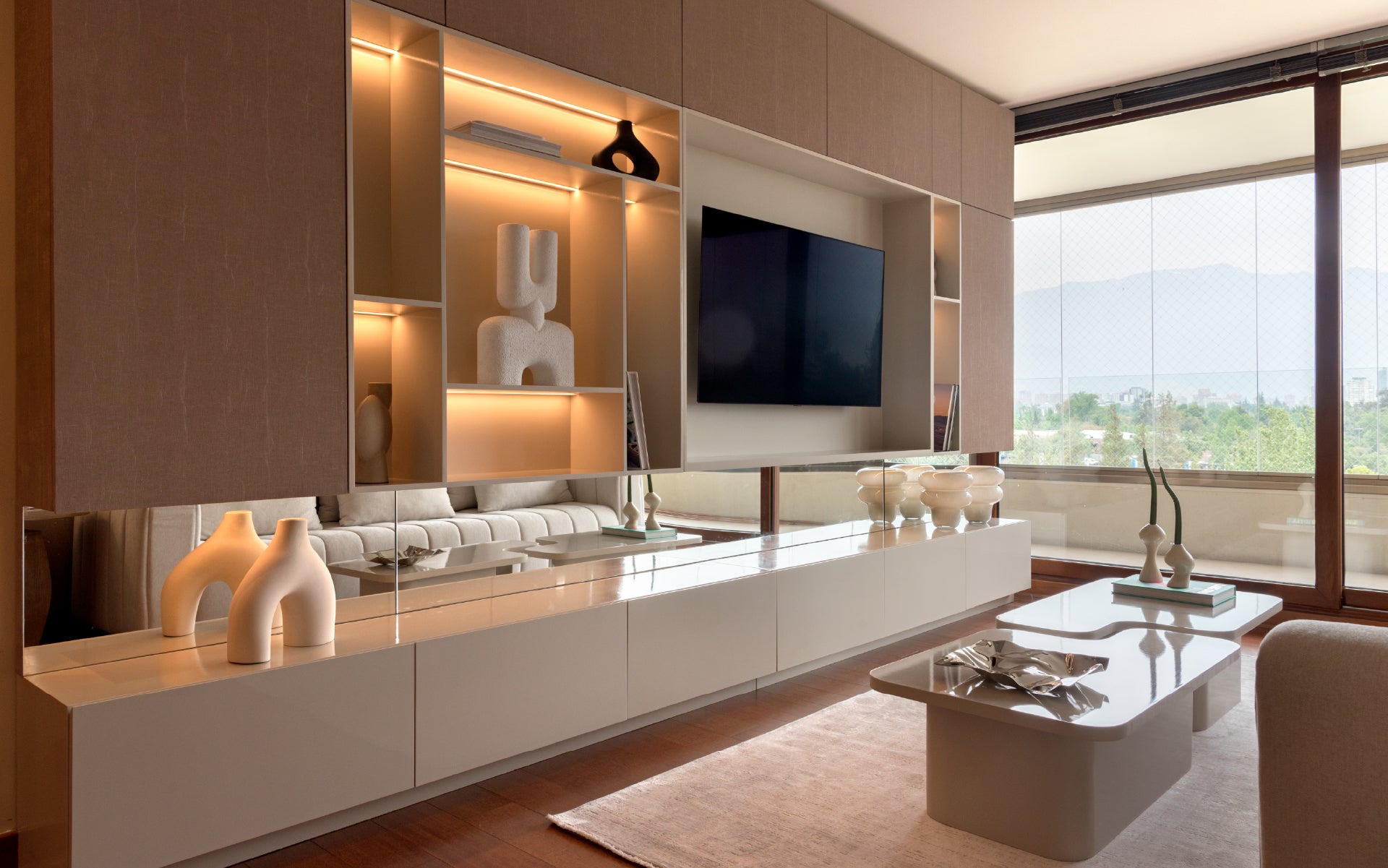 Una sala de estar diseñada en colores atemporales, donde el contraste entre acabados mate y brillantes aporta profundidad y sofisticación. Líneas suaves, iluminación cálida y piezas escultóricas crean un espacio armónico y contemporáneo.