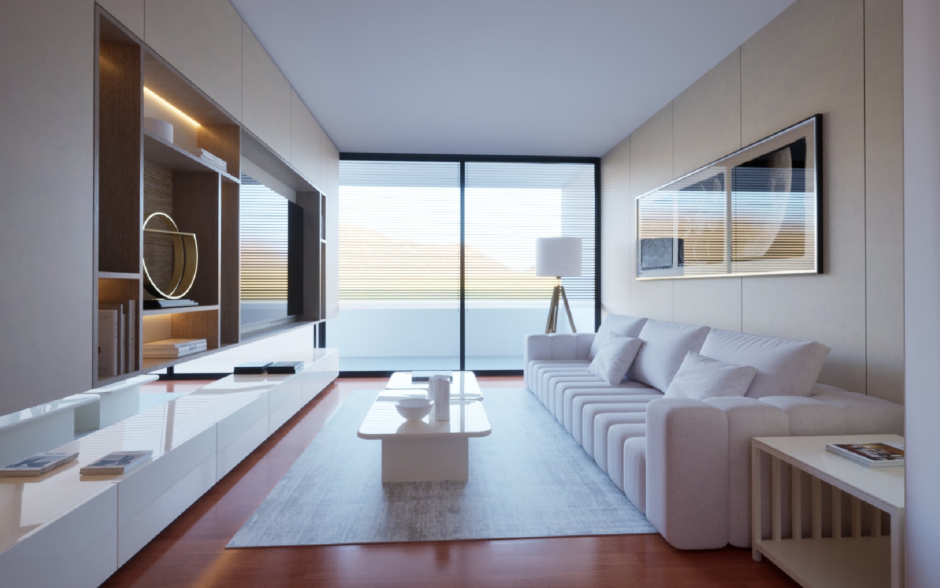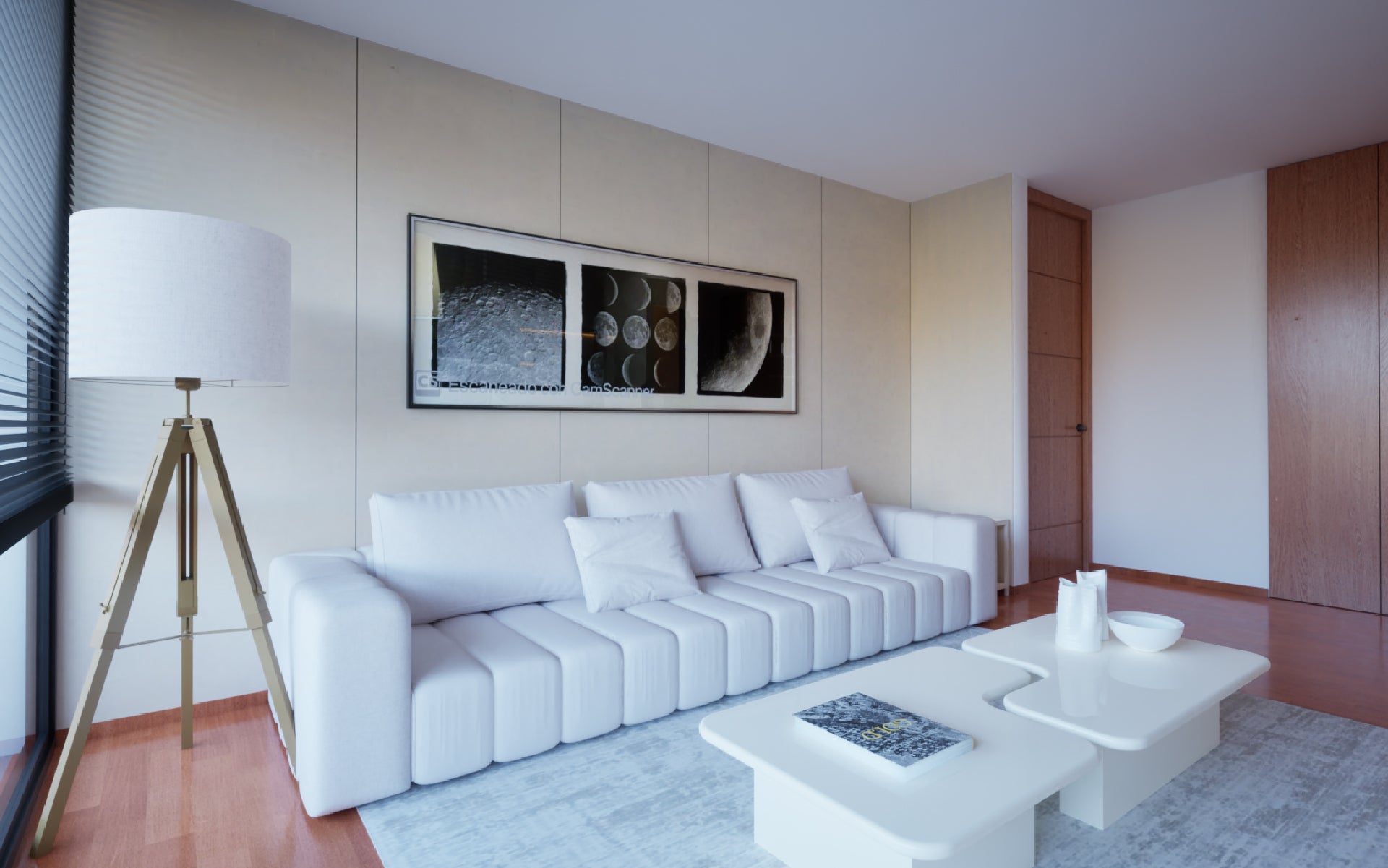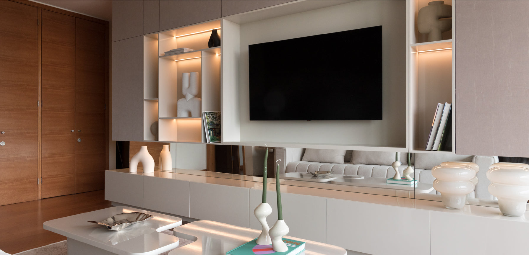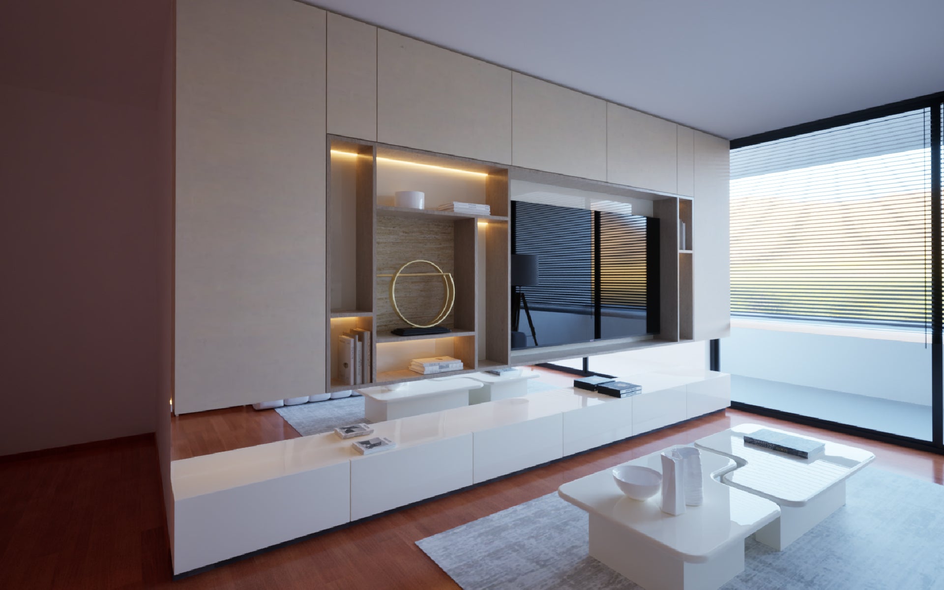 Una sala de estar diseñada en colores atemporales, donde el contraste entre acabados mate y brillantes aporta profundidad y sofisticación. Líneas suaves, iluminación cálida y piezas escultóricas crean un espacio armónico y contemporáneo.