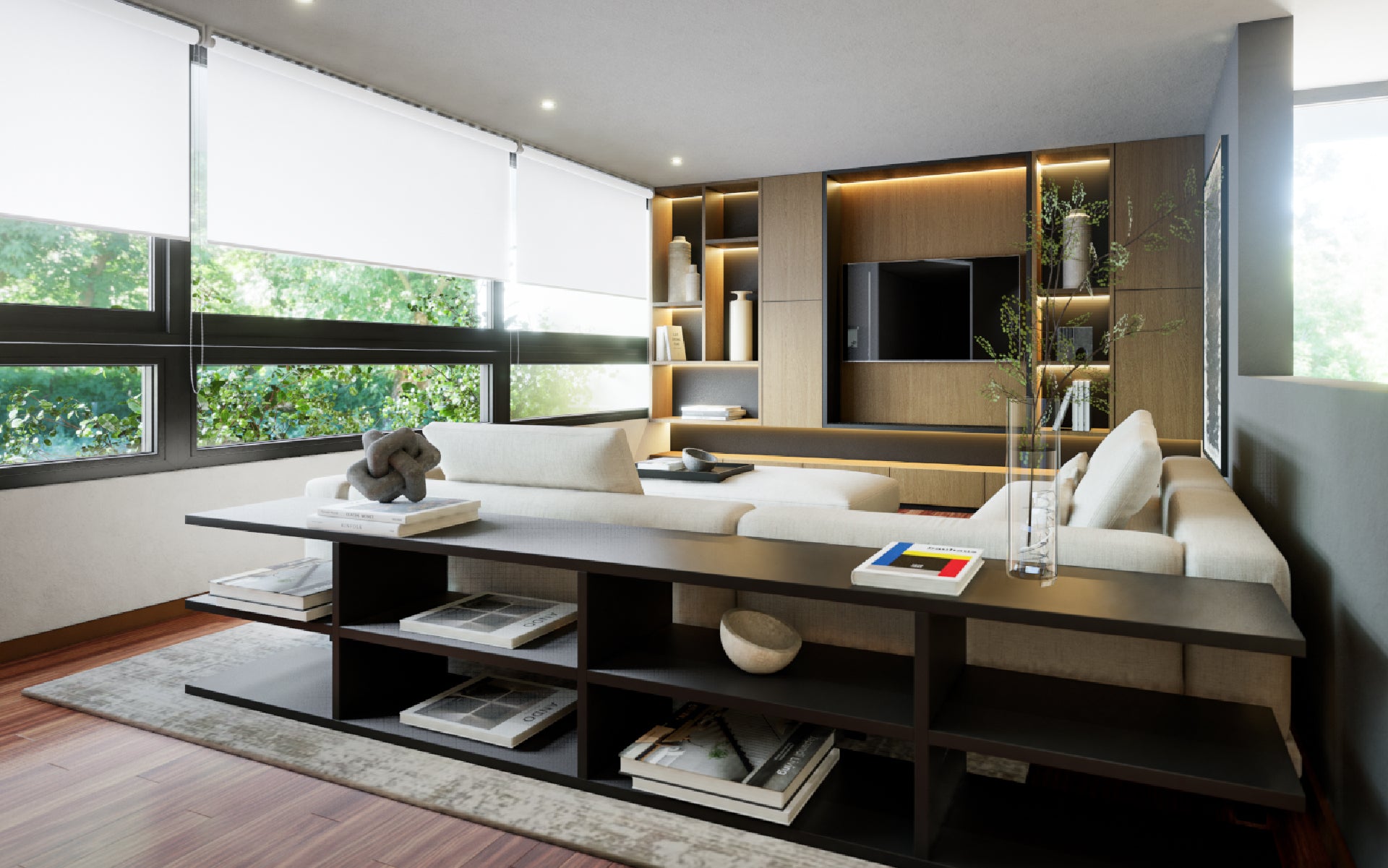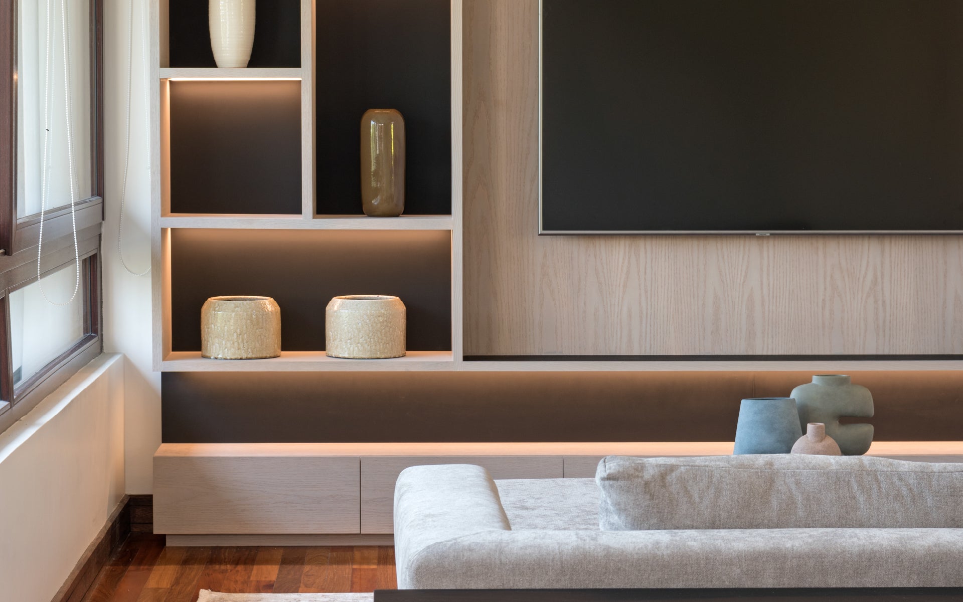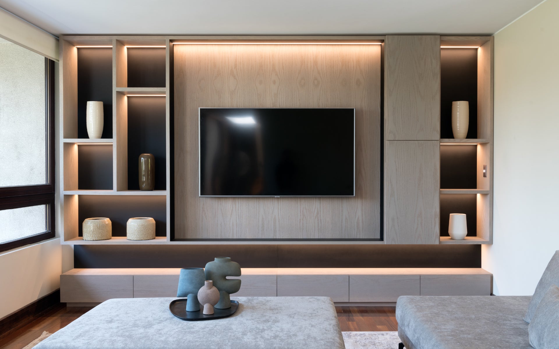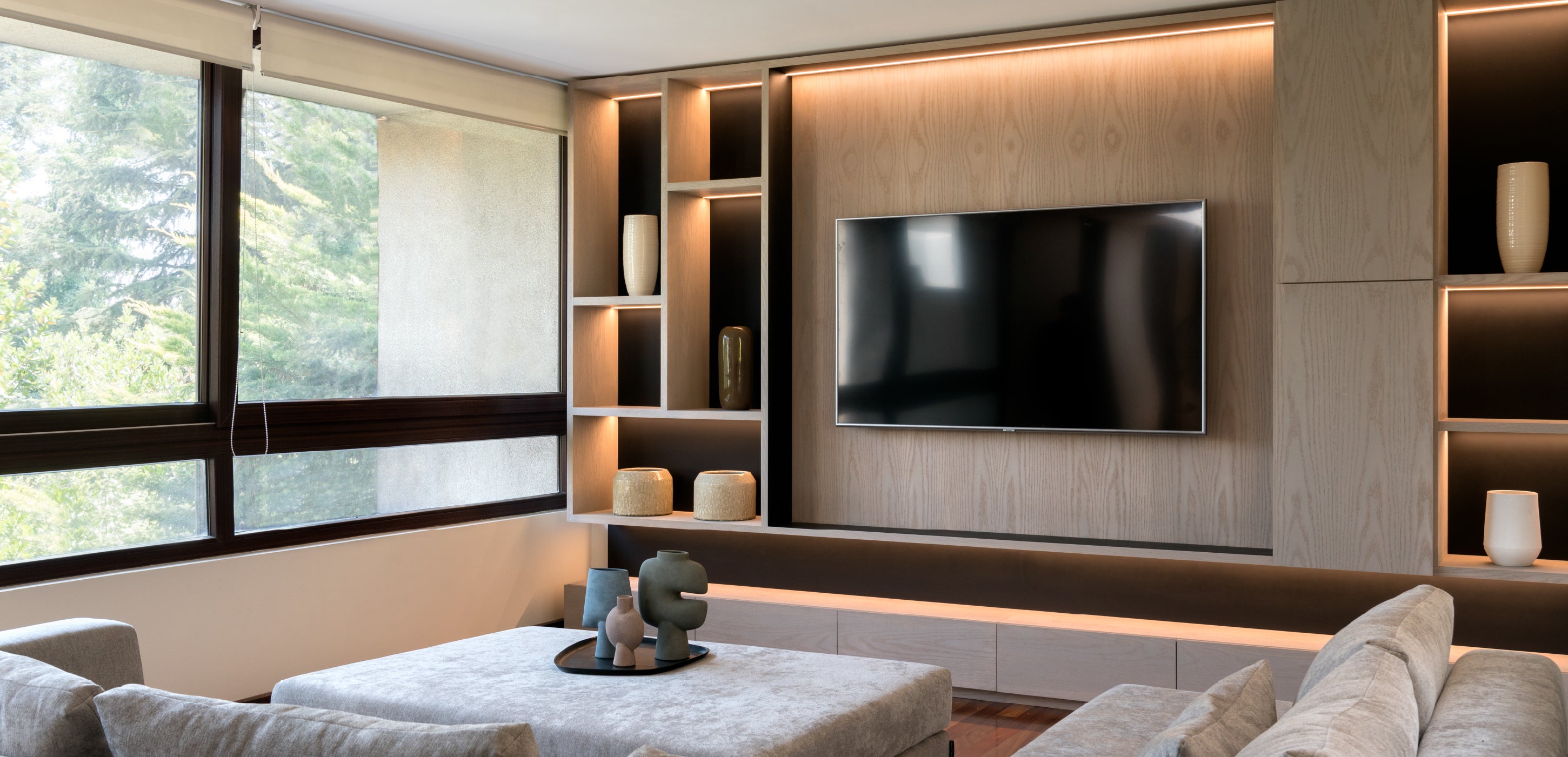 Este proyecto fue diseñado para una clienta que buscaba un espacio ideal para reunirse en familia. Se incorporó un gran sofá en L y un pouf con ruedas que, al unirse, se transforma en un amplio sofá-cama, permitiendo que todos puedan ver televisión y disfrutar cómodamente juntos, creando un ambiente acogedor y funcional para compartir momentos en familia