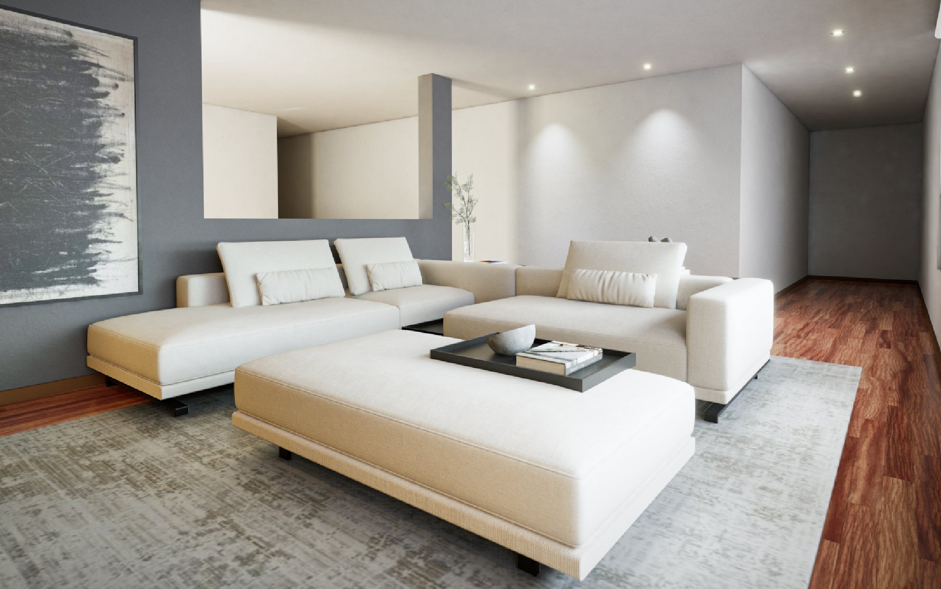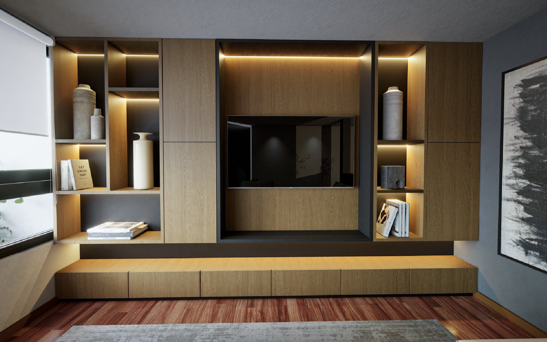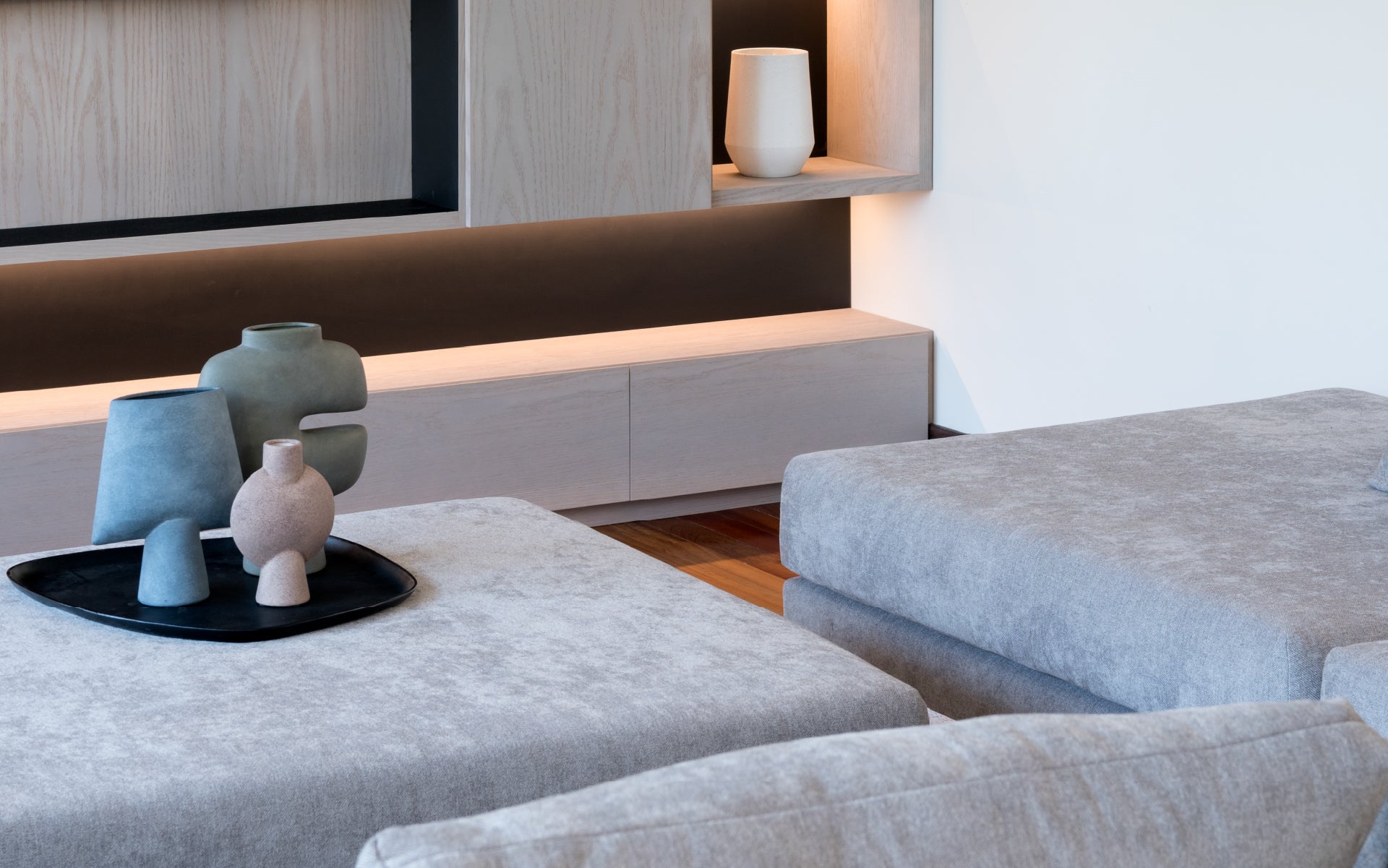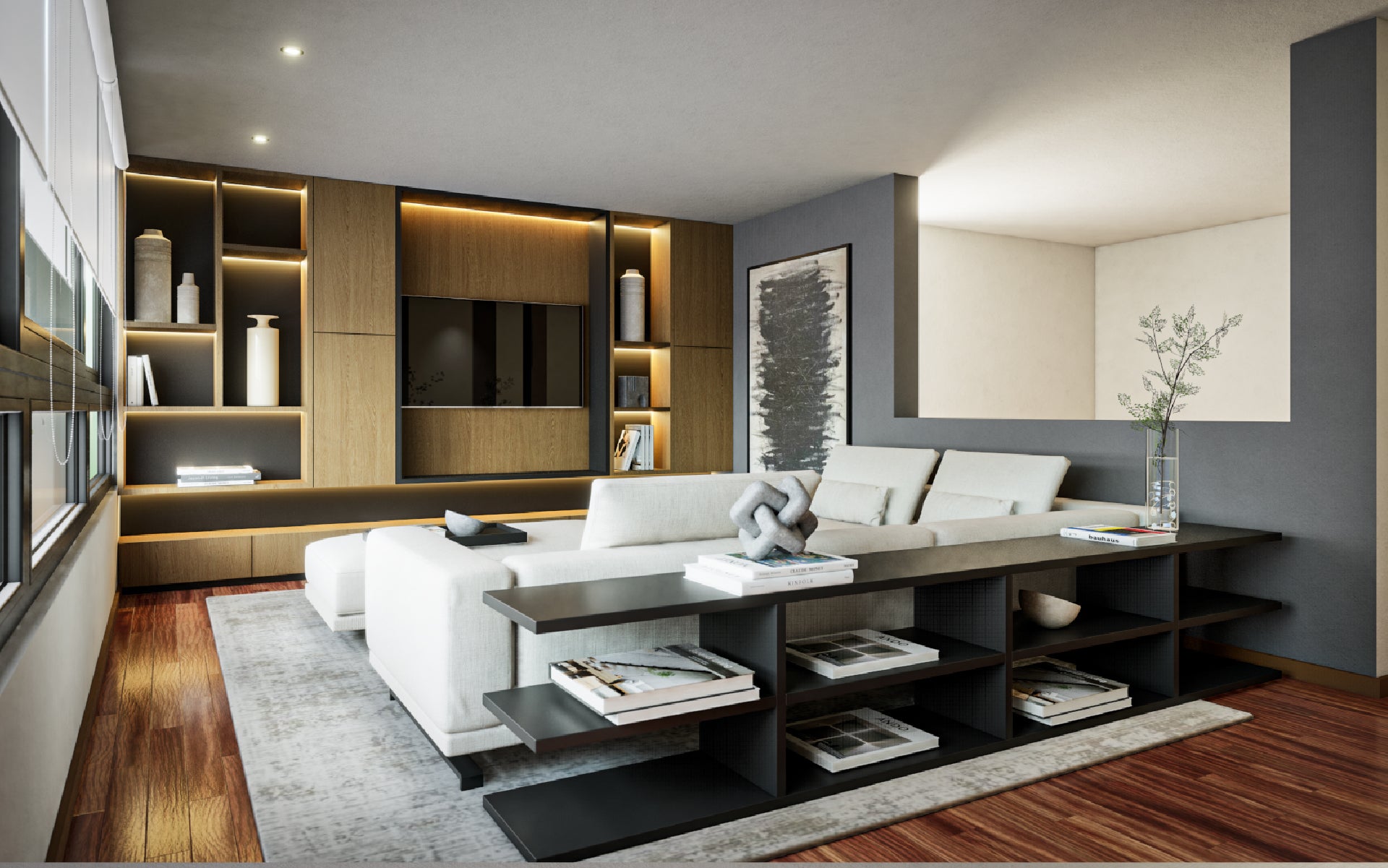 Este proyecto fue diseñado para una clienta que buscaba un espacio ideal para reunirse en familia. Se incorporó un gran sofá en L y un pouf con ruedas que, al unirse, se transforma en un amplio sofá-cama, permitiendo que todos puedan ver televisión y disfrutar cómodamente juntos, creando un ambiente acogedor y funcional para compartir momentos en familia