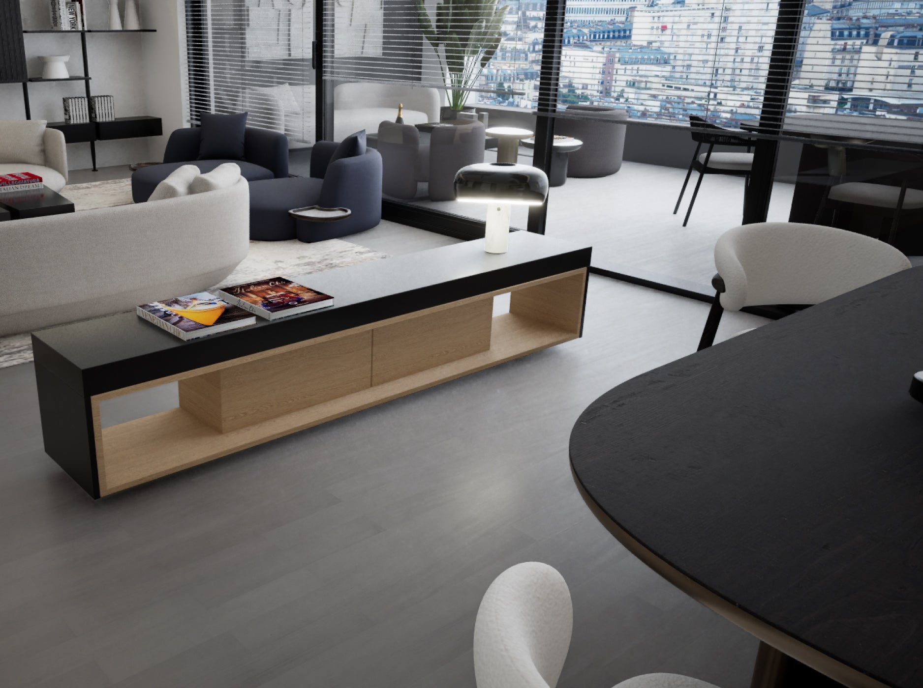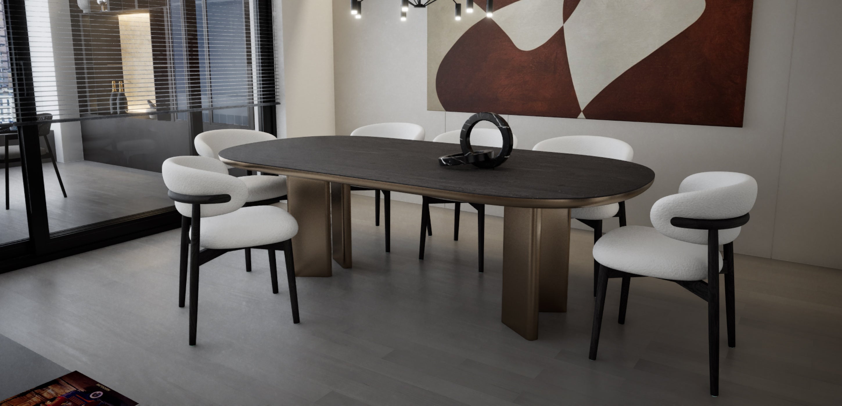 Esta mesa de comedor une diseño y funcionalidad en una pieza que trasciende lo cotidiano. Su base lacada en tono café metalizado aporta un aire contemporáneo, mientras que la cubierta enchapada en encina destaca por su durabilidad y fácil mantención. De líneas suaves y esquinas curvas, está pensada para brindar comodidad al sentarse, evitando molestias con los pies y favoreciendo la interacción. Disponible en distintos tamaños, se adapta tanto a espacios pequeños como a comedores más amplios.