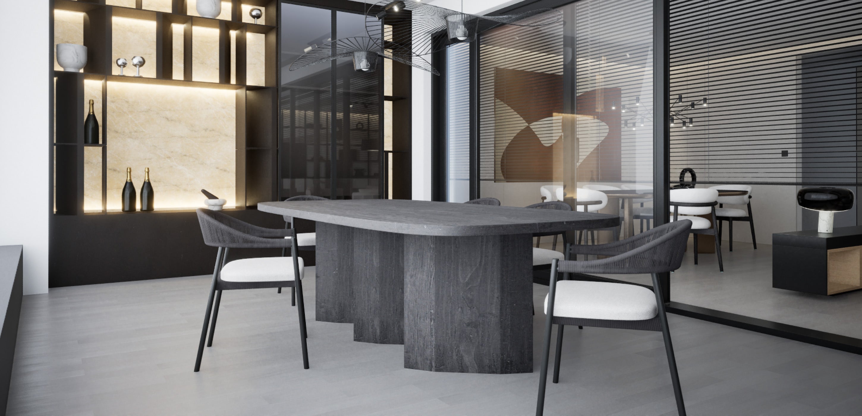 Esta mesa, enchapada en encina —disponible en tono natural o en negro—, es la expresión perfecta de que menos es más. Su cubierta de forma irregular contrasta con la solidez ordenada de sus bases, creando un equilibrio visual que la convierte en un diseño único. A pesar de su simpleza, transmite carácter y sofisticación, siendo una pieza que destaca en cualquier comedor. Atemporal, versátil y llena de intención, es más que una mesa: es un gesto de diseño que equilibra funcionalidad y estética.