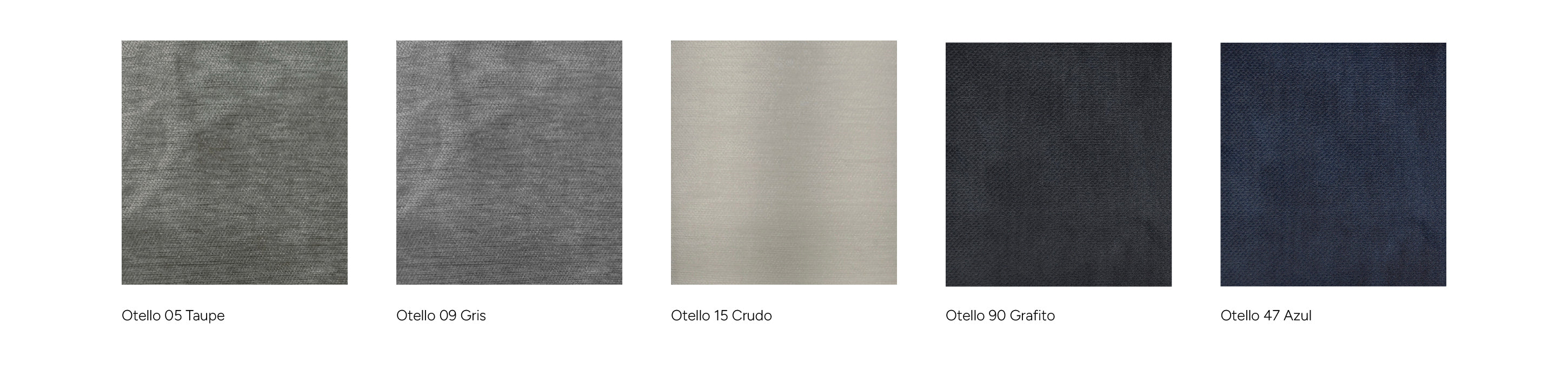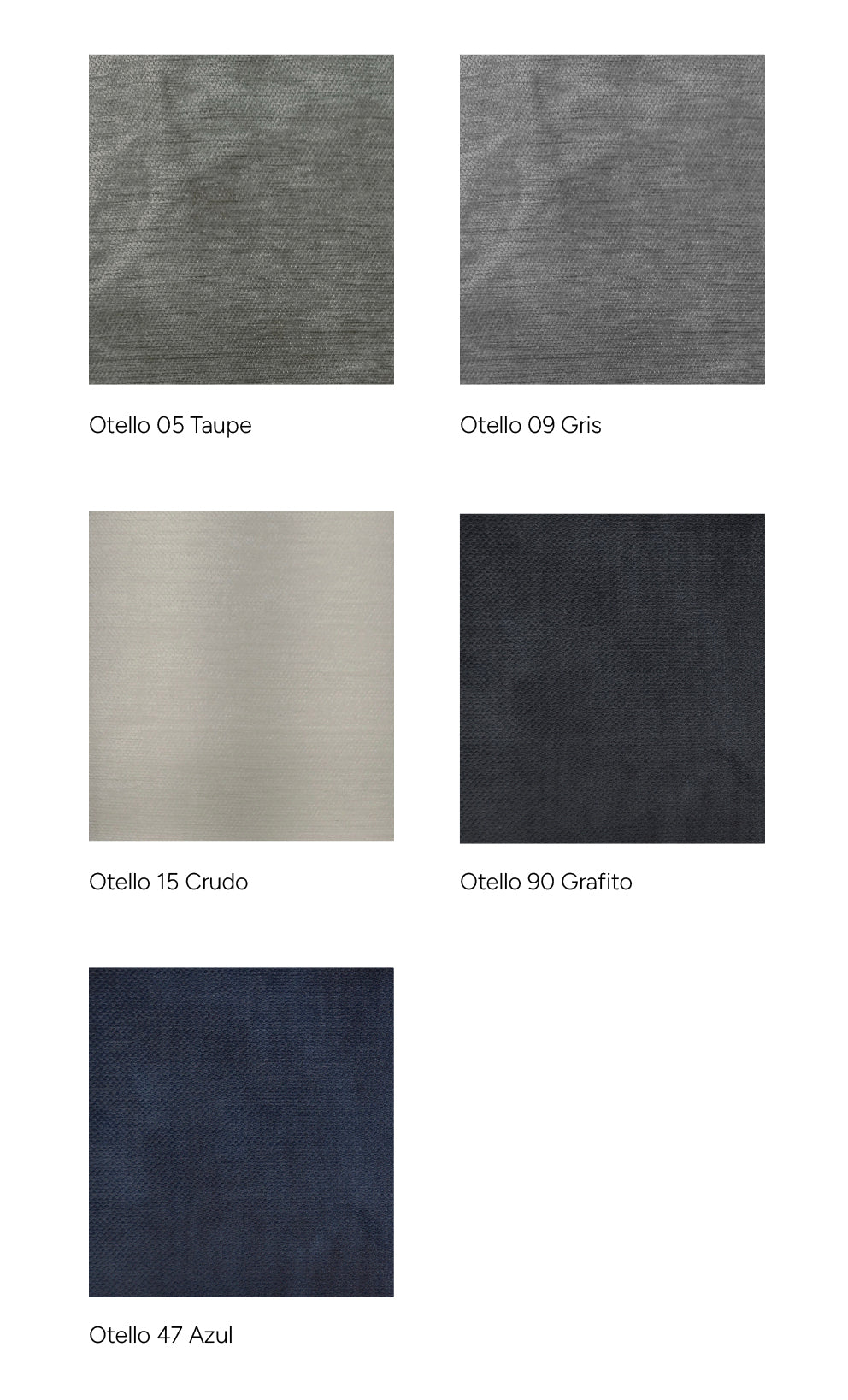 Tela de origen español reconocida por su alta durabilidad y sofisticada textura. El tapiz Otello destaca por su tacto suave y estructura resistente. Su tecnología de fácil mantención permite limpiar únicamente con agua, facilitando el cuidado diario sin comprometer su apariencia ni calidad.